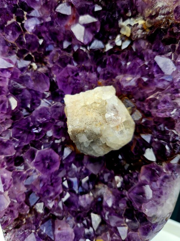 Dominantným prvkom tohto kúsku je výrazný kalcit umiestnený priamo v strede – unikátny detail, ktorý robí tento ametyst skutočne zberateľským skvostom. Kontrast medzi fialovým ametystom a svetlým kalcitom vytvára harmonickú, no zároveň výraznú kompozíciu.