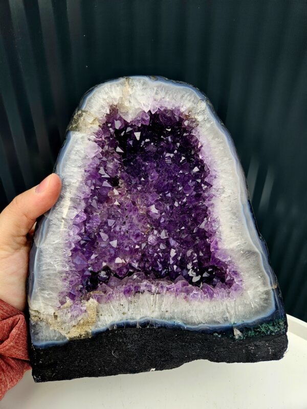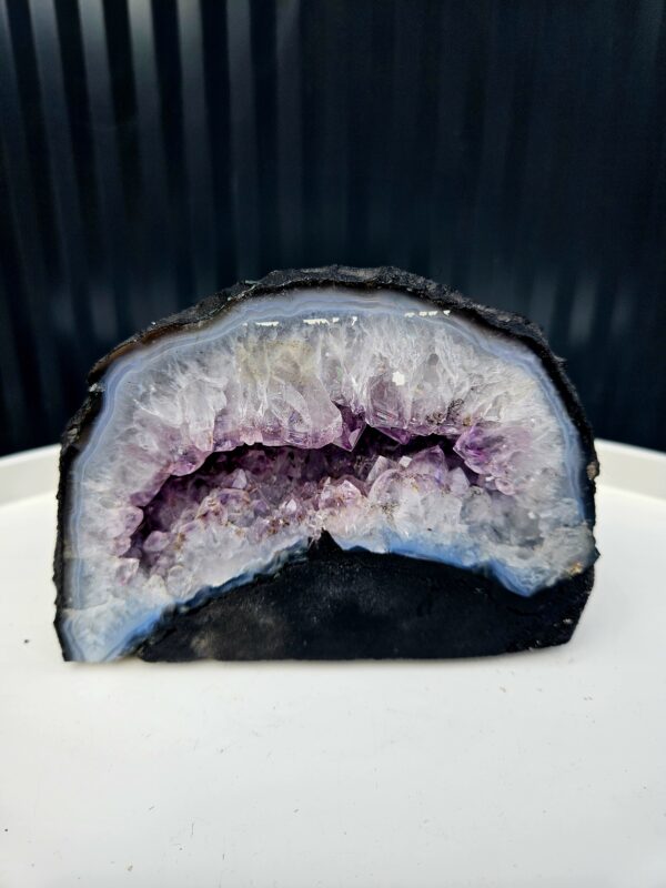 Stred geódy je vyplnený sýto fialovými ametystovými kryštálmi, ktoré sa krásne lesknú a vytvárajú hĺbku a iskru. Okolo nich sa nachádza výrazná vrstva svetlého kremeňa a jemné achátové pásovanie s nádychom do modra, čo dodáva celému kúsku elegantný kontrast
