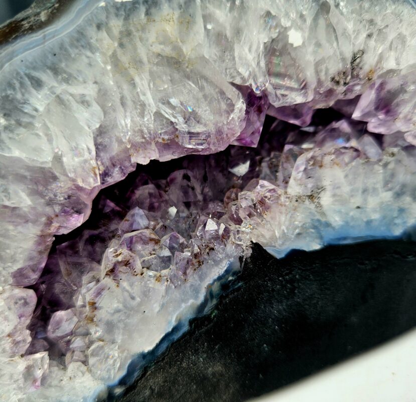 Po otvorení odhaľuje svet fialových ametystových kryštálov, ktoré sú doplnené svetlými, až ľadovo pôsobiacimi kryštálmi (kremeň/kalcit). Okraje zdobí jemné pásovanie achátu s nádychom do modra, čo vytvára nádherný kontrast a zvýrazňuje prirodzenú štruktúru kameňa