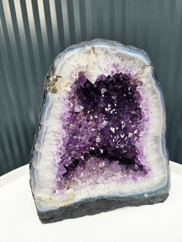 Vysoký „jaskynný“ tvar ukrýva hlboké, sýto fialové kryštály, ktoré sa nádherne lesknú a vytvárajú dojem tajomného vnútorného priestoru. Okraje sú lemované svetlými vrstvami kremeňa a jemným achátovým pásovaním, čo ešte viac zvýrazňuje kontrast medzi surovým povrchom a trblietavým vnútrom