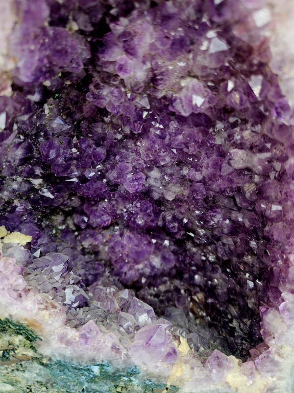 Vnútro geódy je bohato vyplnené trblietavými fialovými kryštálmi ametystu, ktoré vytvárajú hĺbku a iskru. Okraje lemuje svetlá vrstva kremeňa a jemné achátové pásovanie, zatiaľ čo spodná časť zaujme prírodnými „machovými“ kresbami v zelených a modrastých tónoch – každý detail je originál
