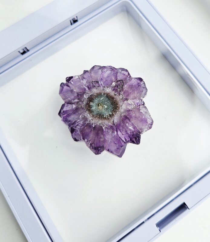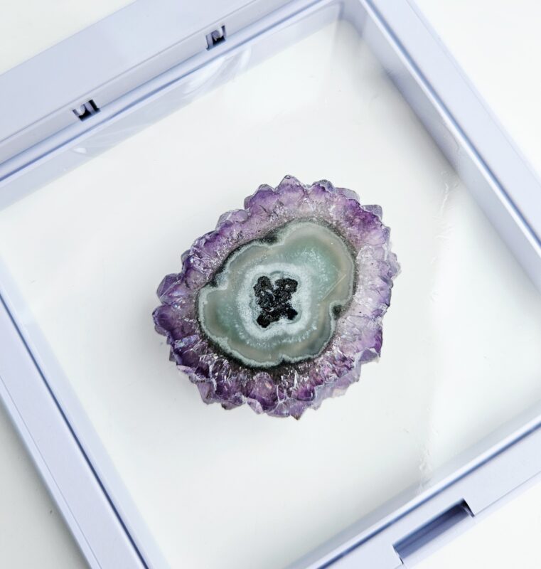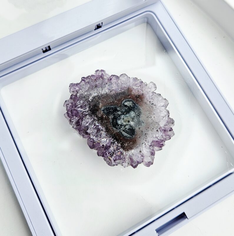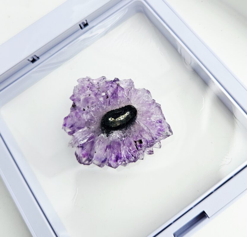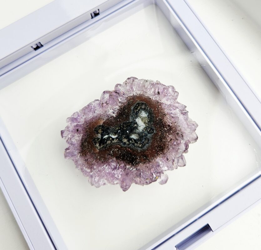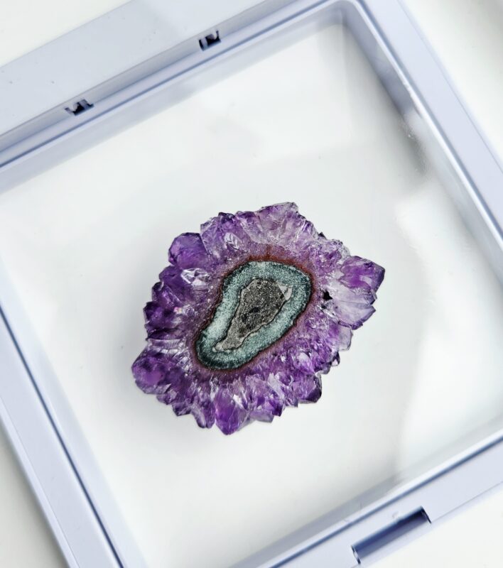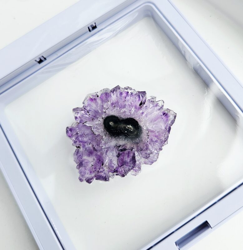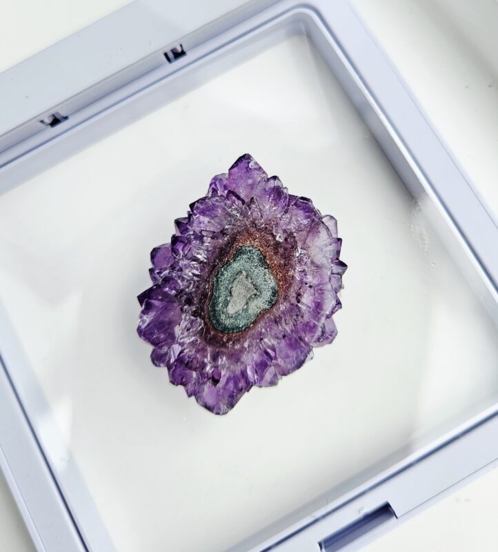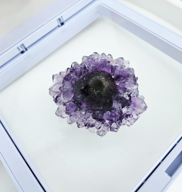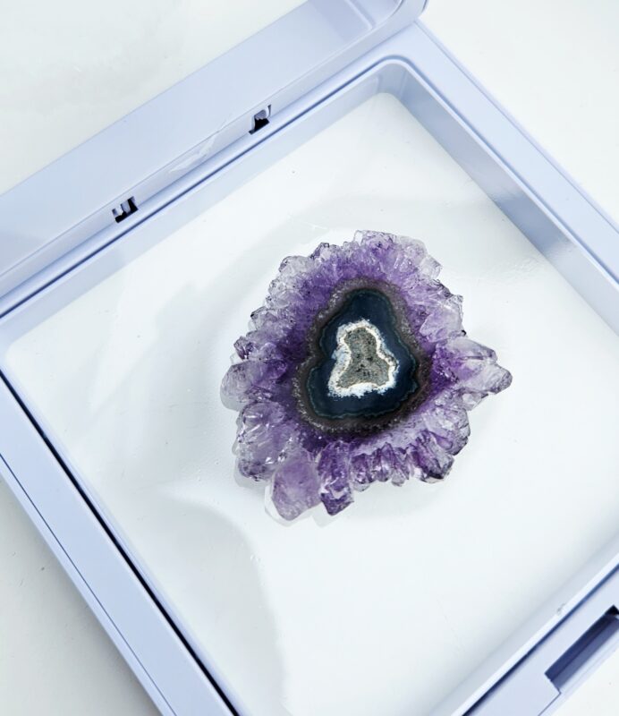 Tento jedinečný ametystový stalaktit s priemerom cca 3,5 cm je malý, no mimoriadne výrazný kúsok, ktorý v sebe ukrýva tisíce rokov prírodného procesu. Vznikal postupným usadzovaním minerálov z kvapkajúcej vody v dutinách hornín – vrstvu po vrstve, až vytvoril fascinujúci „kvet“ kryštálov s nádherným stredom.