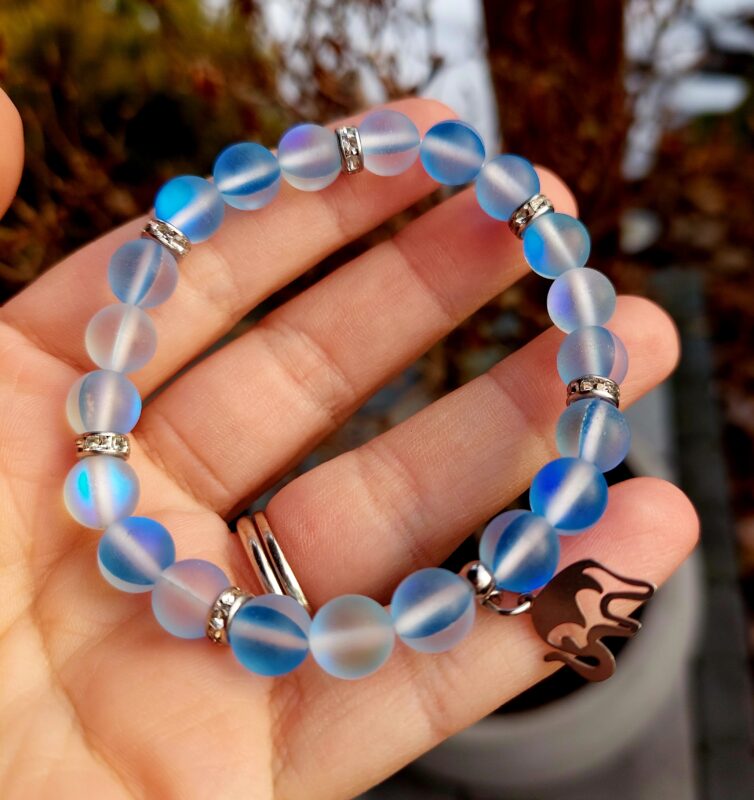 Náramok je navlečený na kvalitnej elastickej gumičke pre pohodlné nosenie. Kovové komponenty a prívesok sú vyrobené z chirurgickej ocele, vhodnej aj pre citlivú pokožku.