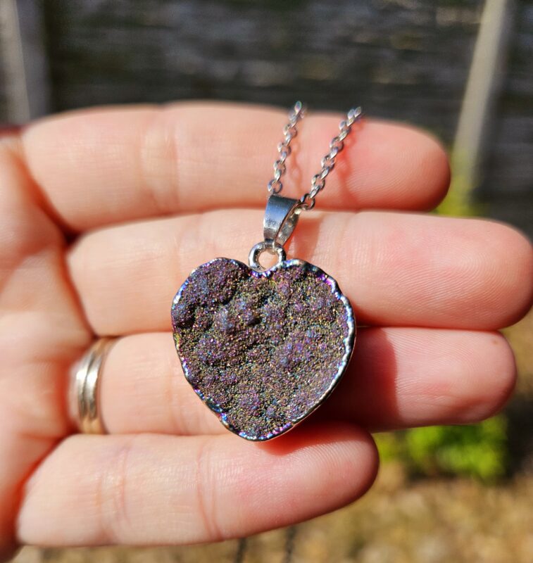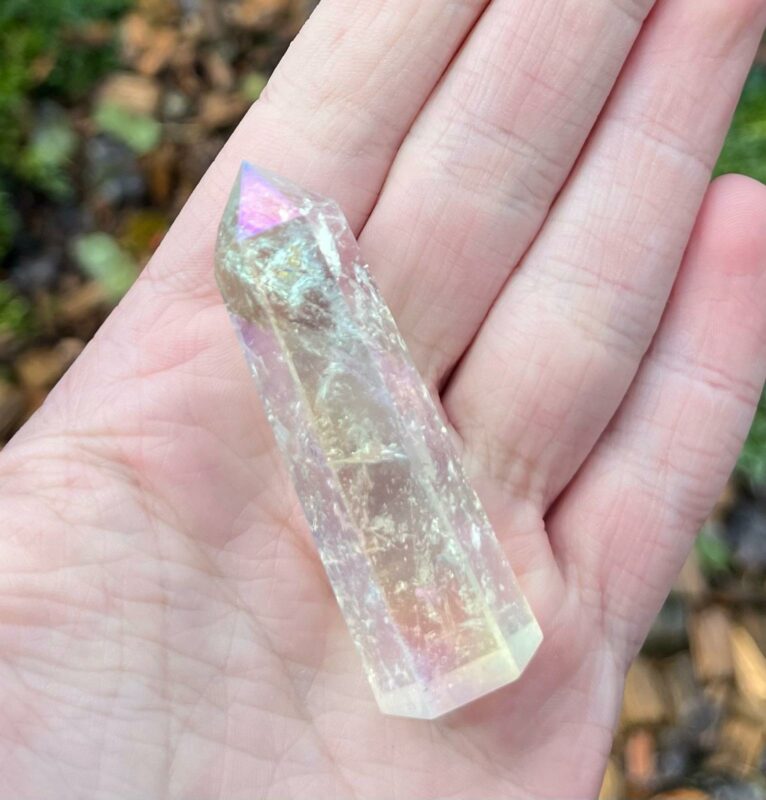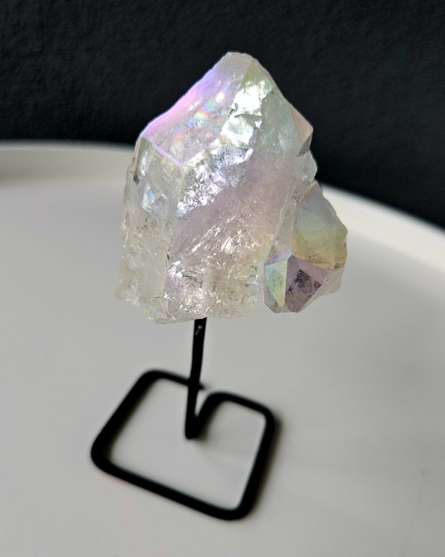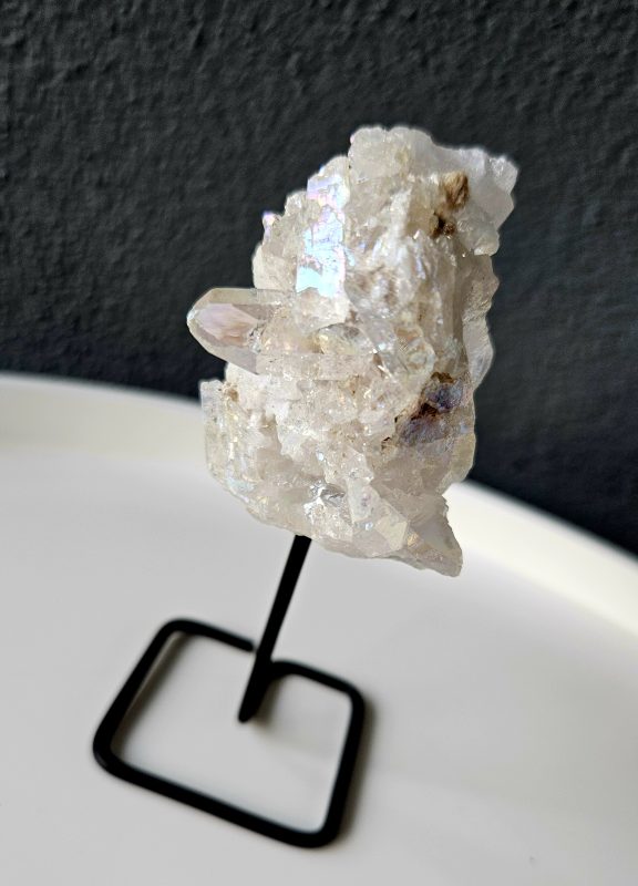 Táto očarujúca Aqua Aura drúza je spojením prírodnej krásy krištáľu a alchýmie svetla. Jej povrch hrá fascinujúcimi dúhovými odleskami v odtieňoch zlata, tyrkysu, fialovej a modrej – ako zachytený kúsok vesmíru vo Vašej dlani.
