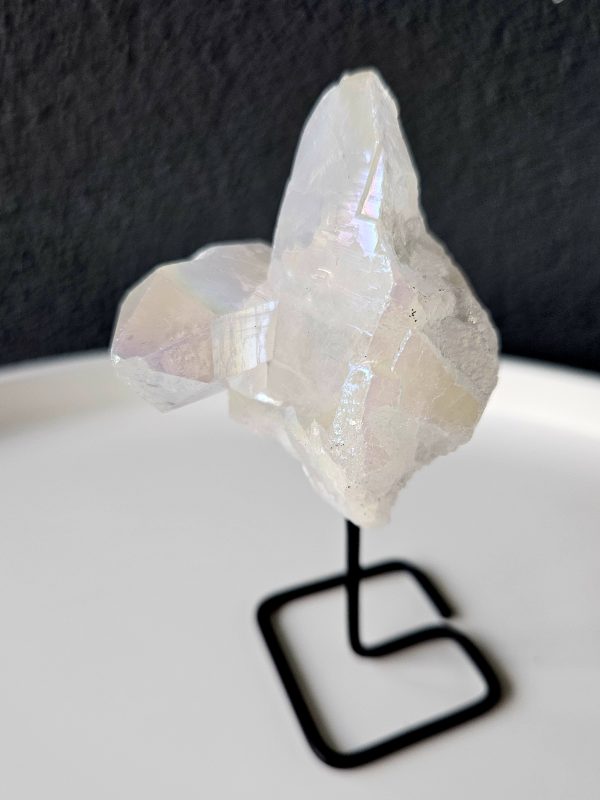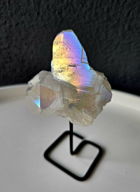 Aqua Aura vzniká spojením čistého krištáľu s ušľachtilým kovom, čím získava svoj charakteristický kovový lesk a éterickú žiaru. Každý kryštál na povrchu odráža svetlo inak, čím vytvára jedinečnú hru farieb a hĺbky.