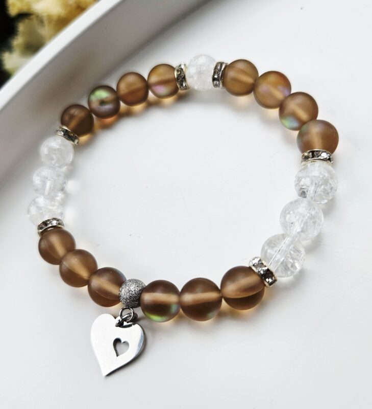 Elegantný náramok z hnedej aqua aury v matnom prevedení je doplnený o praskaný krištáľ, ktorý zosilňuje energiu a prináša harmóniu. Jemný kovový detail a prívesok v tvare srdca dodávajú náramku ženskosť a nadčasový vzhľad.