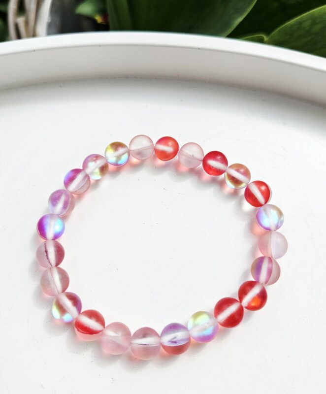 Tento očarujúci náramok z aqua aura kameňa v červených a jemne ružových odtieňoch doplnených dúhovými odleskami pôsobí hravo, žensky a výnimočne.