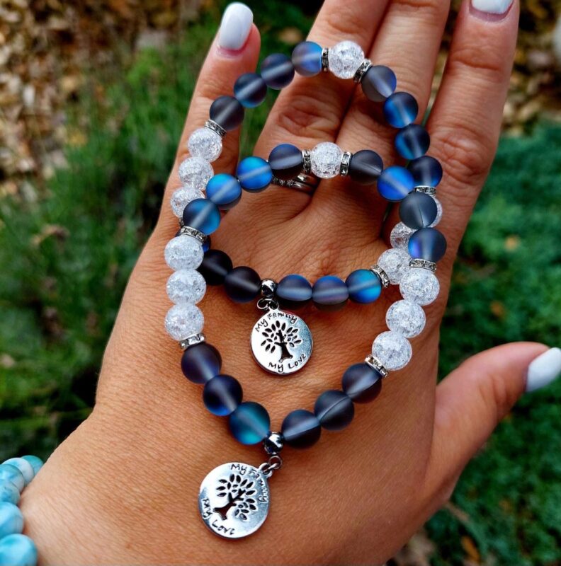 Aqua Aura šedá+ Krištáľ náramok 8mm Strom života
