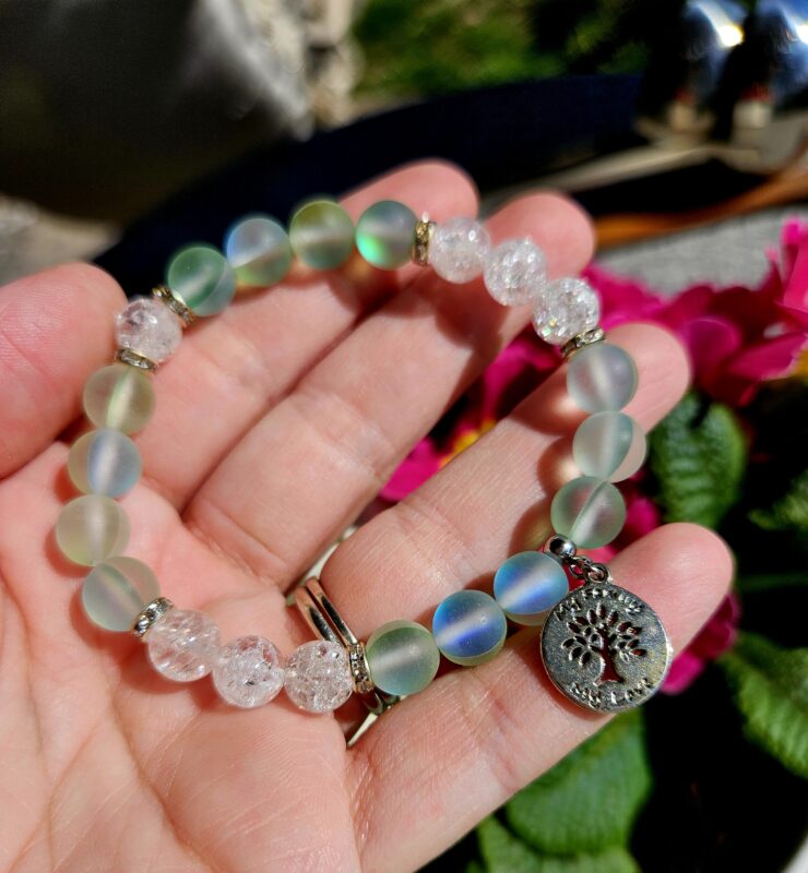 Aqua Aura zelená + Krištáľ náramok 8mm Strom života