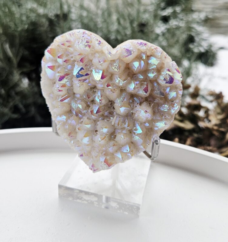 Toto nádherné srdce z aqua aury očarí na prvý pohľad svojím dúhovým leskom a jemnou, anjelskou energiou. Povrch kryštálu sa trblieta v pastelových odtieňoch modrej, ružovej a fialovej, ktoré vznikajú špeciálnou úpravou prírodného krištáľu.
