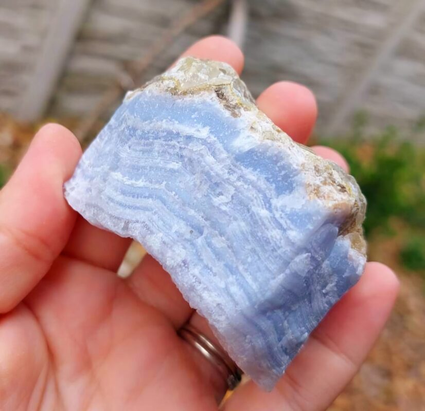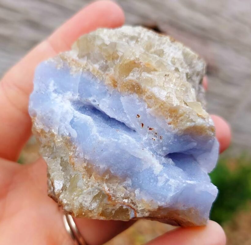 Materiál: modrý chalcedón s kremeňom (prírodný surový kus)