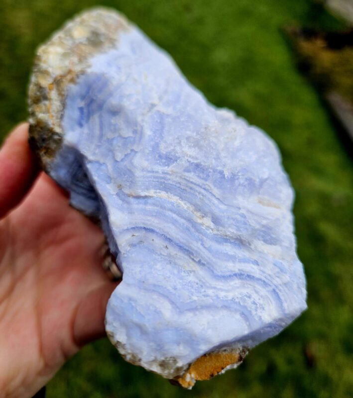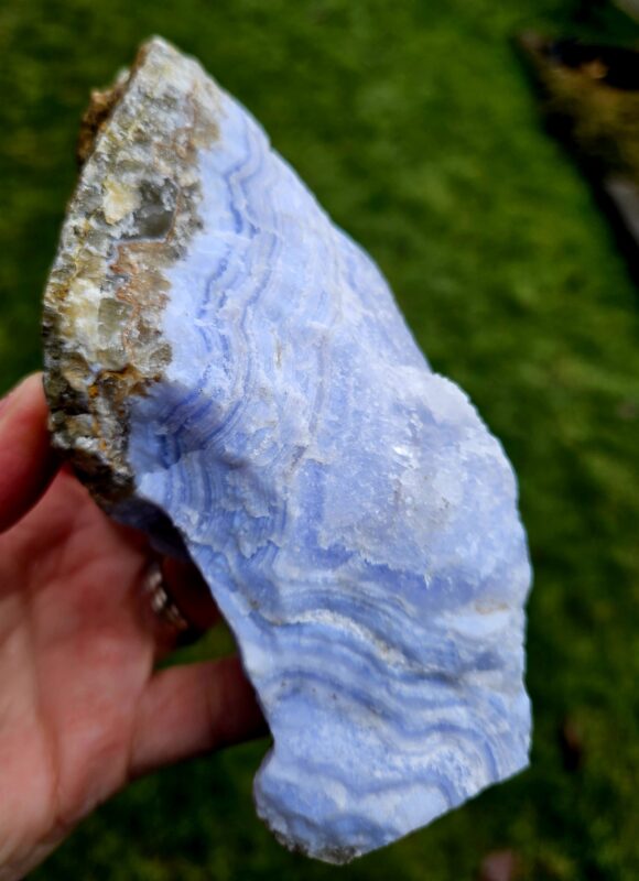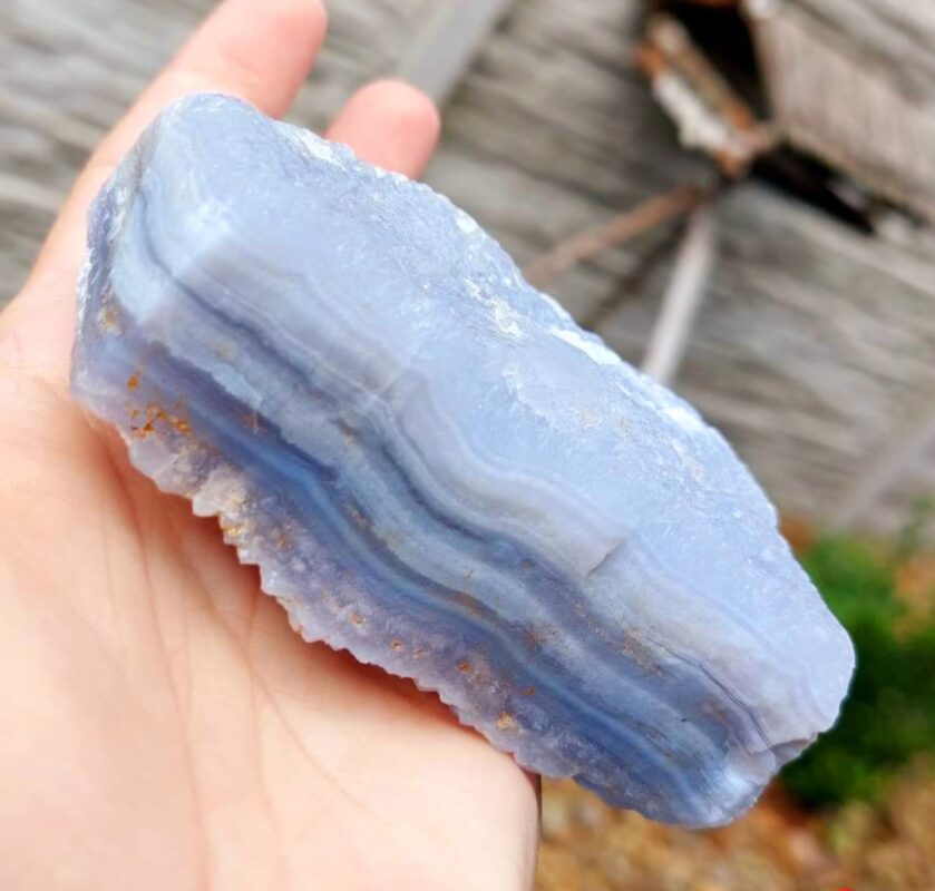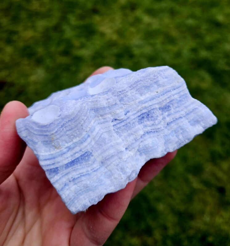 Prírodný modrý chalcedón vo vysokej zberateľskej kvalite vyniká jemným páskovaním a príjemným svetlomodrým odtieňom, ktorý je typický pre kvalitné exempláre tohto minerálu. Každý kus je originál s prirodzenou kresbou vrstiev vytvorených počas miliónov rokov.