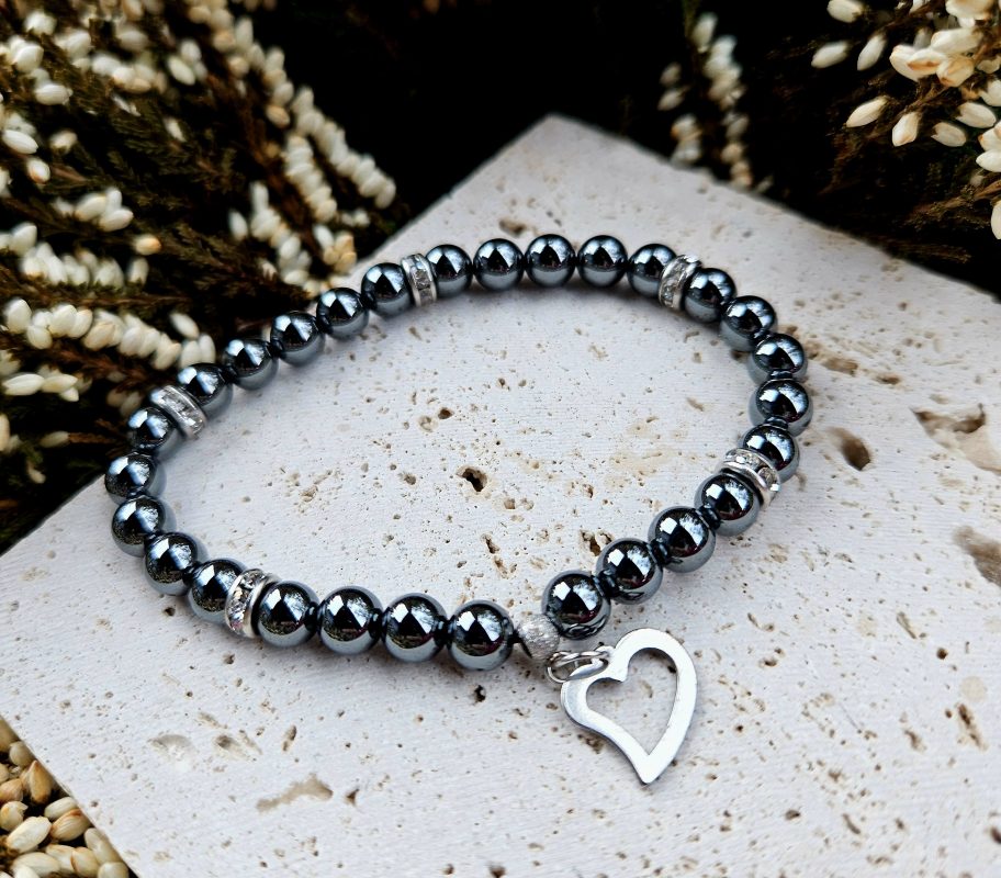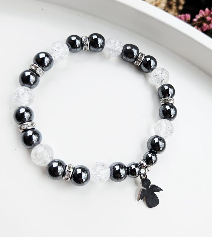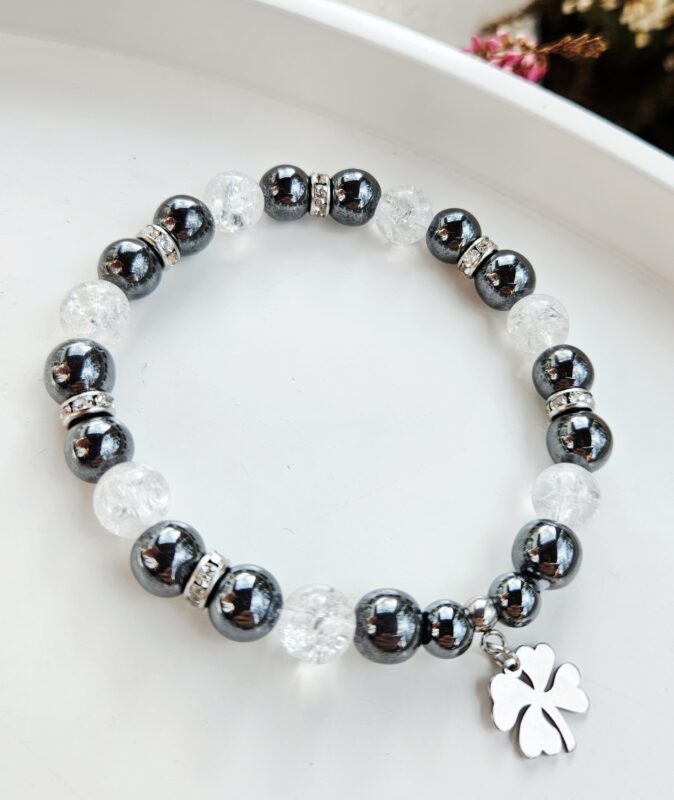 Elegantný náramok spája lesklý hematit s jemne štruktúrovaným praskaným krištáľom, čím vytvára harmonický kontrast tmavého kovového lesku a čistej priehľadnej energie. Kombinácia minerálov pôsobí moderne, nadčasovo a je vhodná na každodenné nosenie aj ako štýlový doplnok k elegantnému outfitu.