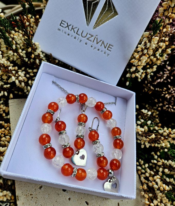 Karneol + Krištáľ 8mm set chir.oceľ (náramok, prívesok na retiazke, náušnice,krabička)