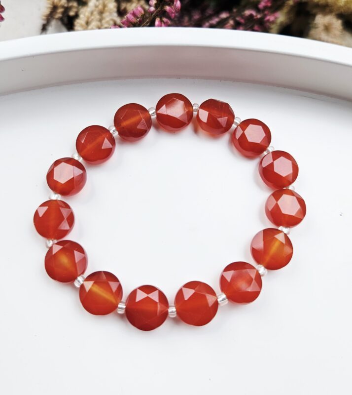 Elegantný náramok z prírodného karneolu zaujme svojou sýto oranžovo-červenou farbou a jemným leskom fazetovaných kamienkov. Precízne brúsené kružky s priemerom 10 mm krásne odrážajú svetlo a dodávajú šperku výrazný, no stále elegantný vzhľad. Náramok je navlečený na kvalitnej elastickej gumičke, vďaka čomu sa pohodlne nosí každý deň.