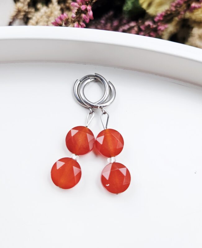 Elegantné náušnice z prírodného karneolu zaujmú svojou teplou oranžovo-červenou farbou a jemným leskom fazetovaných kamienkov, ktoré krásne odrážajú svetlo pri každom pohybe. Ich jednoduchý, no výrazný dizajn sa ľahko kombinuje s rôznymi štýlmi a dodáva outfitu energiu a ženskosť.