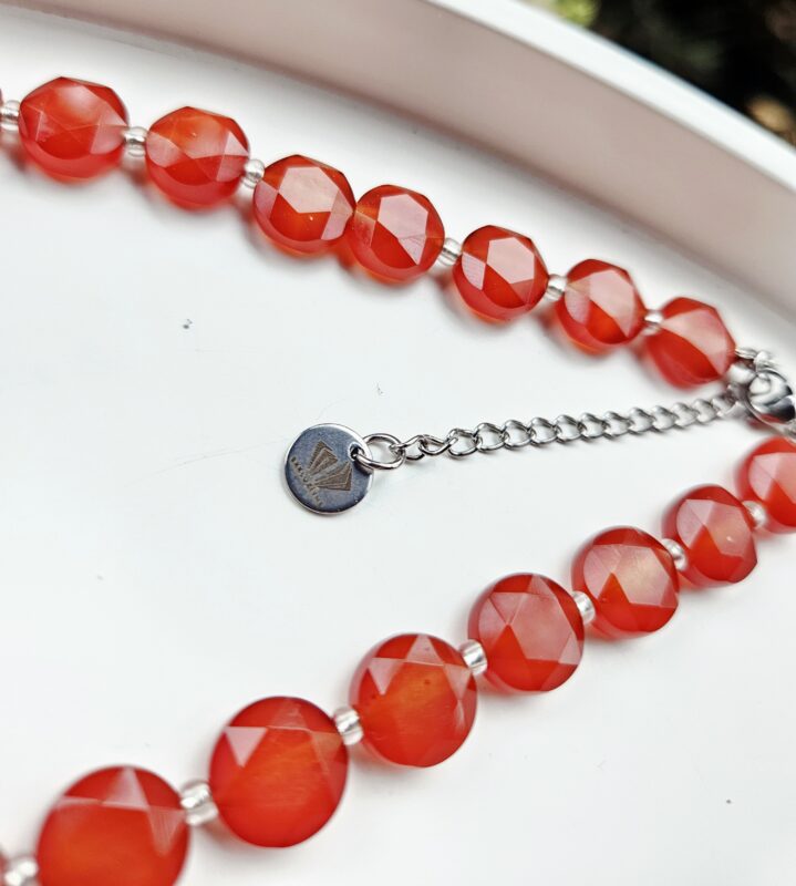 Elegantný náhrdelník z prírodného karneolu očarí svojou teplou oranžovo-červenou farbou a jemným leskom precízne fazetovaných kamienkov, ktoré krásne odrážajú svetlo pri každom pohybe. Tento nadčasový šperk dodá každému outfitu energiu, ženskosť a výrazný, no stále elegantný akcent.