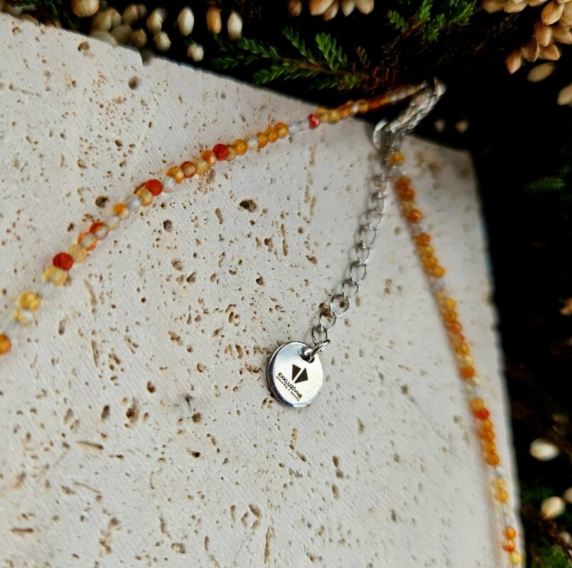 Jemný a zároveň výrazný náhrdelník z prírodného karneolu, vybrúseného do tvaru drobných hviezdičiek s veľkosťou približne 6 mm. Teplé odtiene oranžovej, medovej a červenej vytvárajú harmonický prechod farieb, ktorý pôsobí energicky a elegantne zároveň. Karneol je tradične spájaný s vitalitou, odvahou a podporou tvorivej energie, preto je ideálnym doplnkom na každodenné nosenie aj ako symbolický darček.