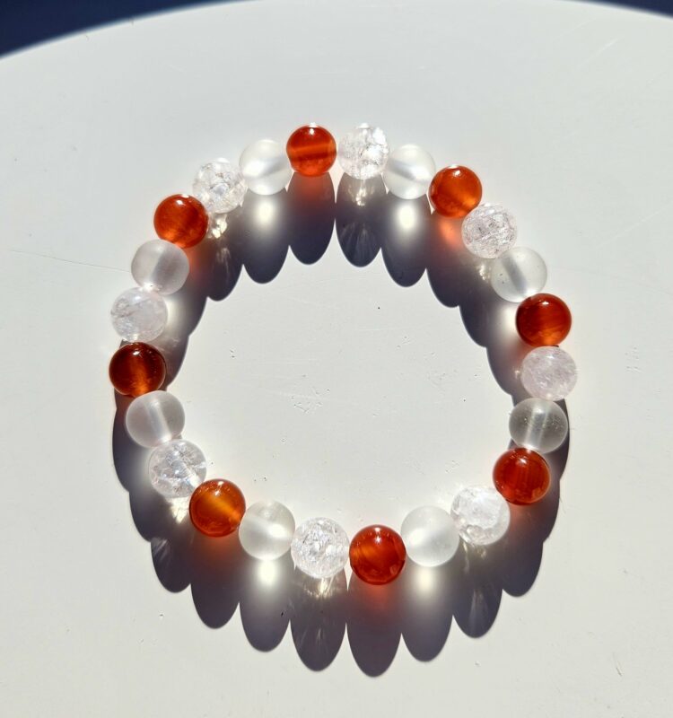 Jemný a zároveň energický náramok vytvorený z praskaného krištáľu, matného krištáľu a prírodného karneolu – kameňa vitality, odvahy a životnej energie