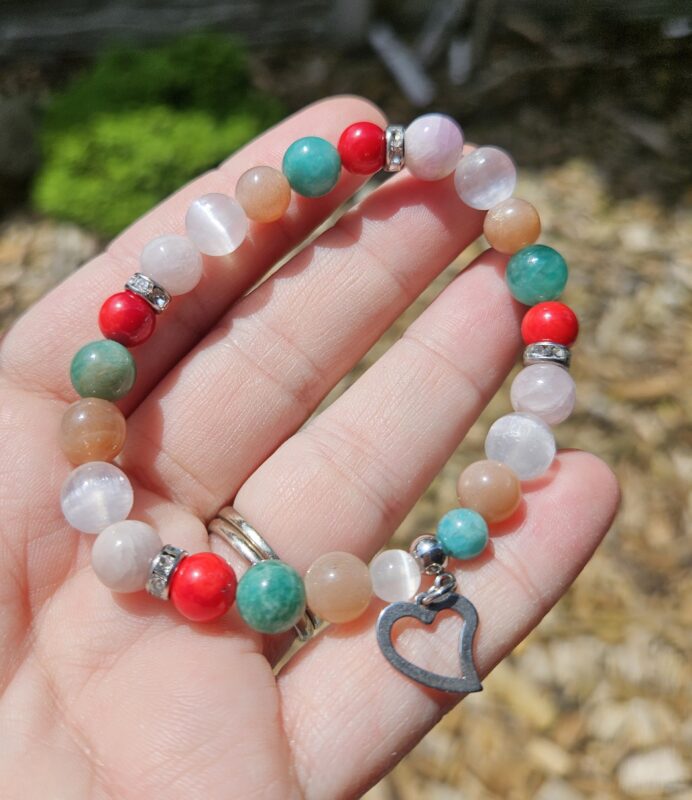 Koral červený + Selenit + Slnečný kameň + Amazonit +Kunzit náramok Priemer guličiek 8mm Kov - chirurgická oceľ prívesok aj komponenty Náramok je navlečený na gumičke Veľkosť náramku je 16-17 cm. Zmenu veľkosti napíšte do poznámky.