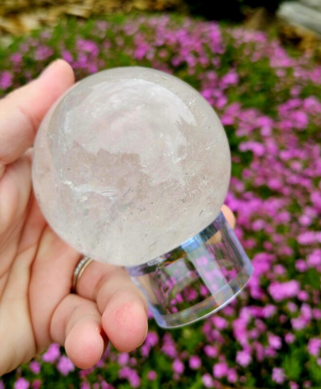 Táto nádherná krištáľová guľa je symbolom celistvosti, rovnováhy a plynúcej energie. Jej jemne mliečno-číra štruktúra ukrýva fascinujúce vnútorné svety, ktoré pri dopade svetla odhaľujú aj krásne dúhové odlesky