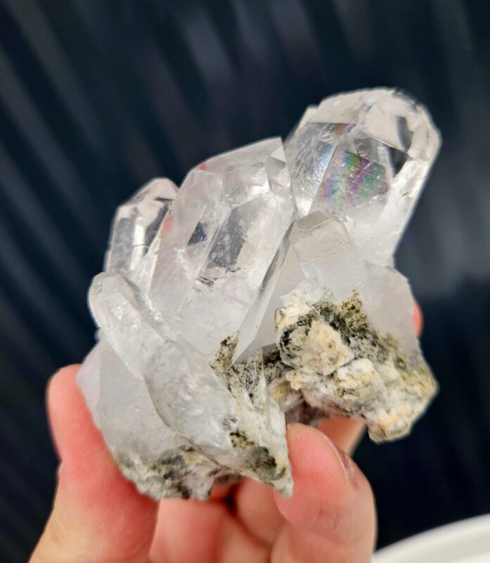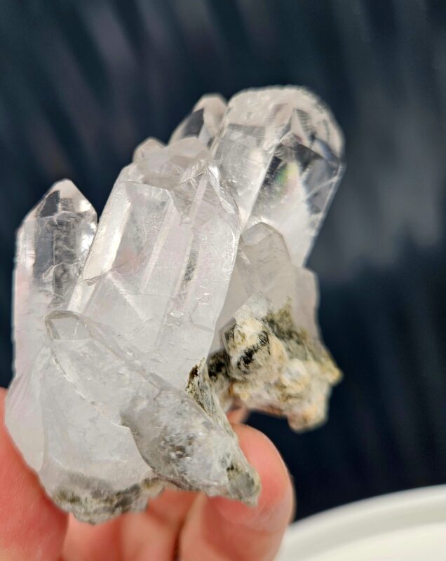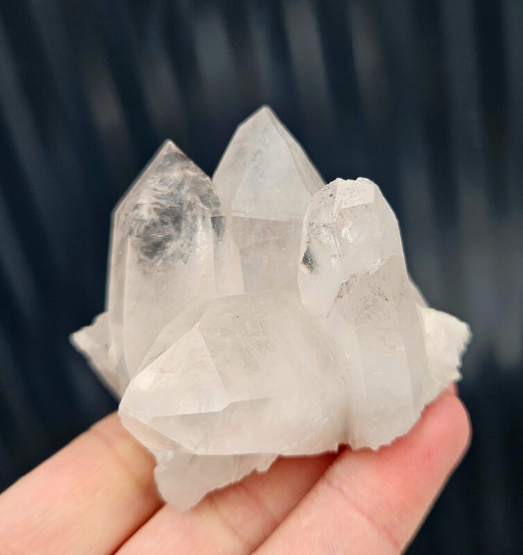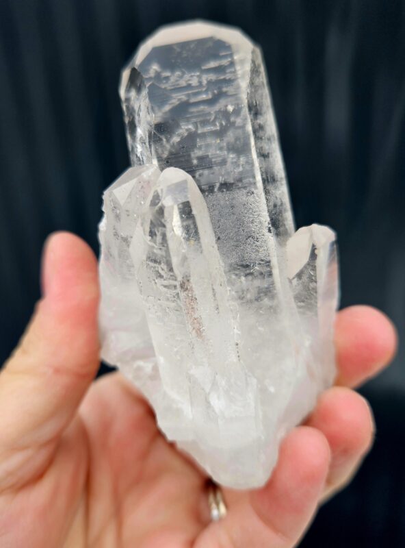Táto krásna krištáľová drúza zaujme výrazným hlavným hrotom, na ktorom sú viditeľné jemné prirodzené ryhy a vrstvy. Ide o tzv. rastové línie – stopu toho, ako kryštál postupne vznikal v prírode.