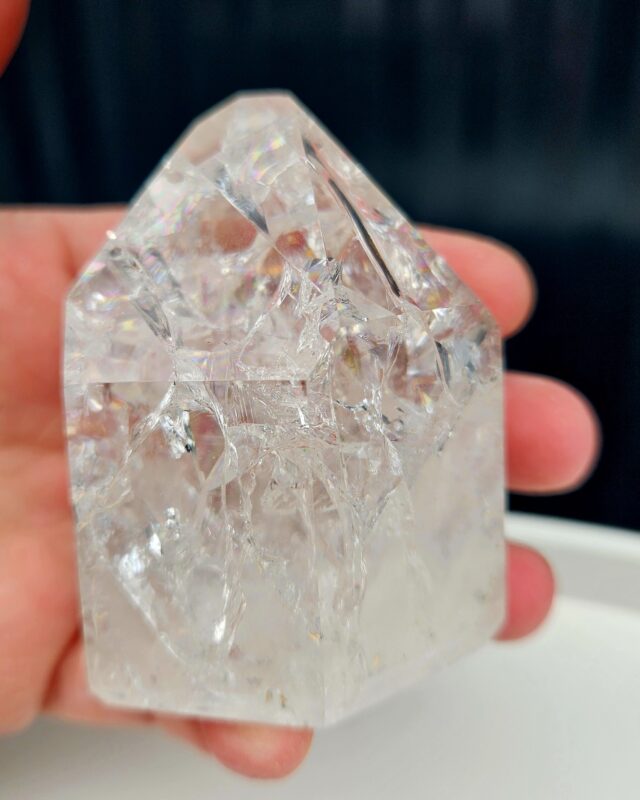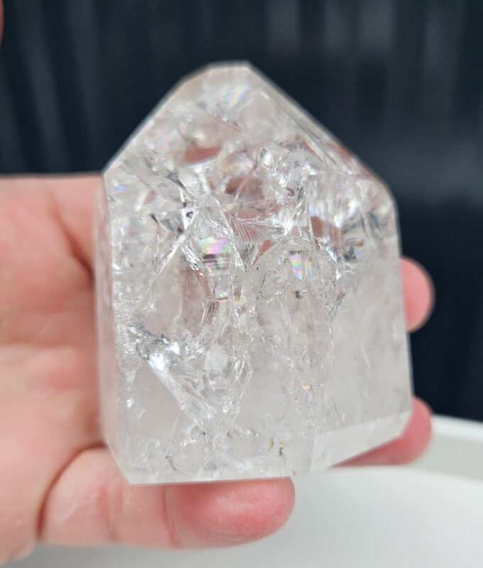 Jeho vnútro je bohato prežiarené jemnými prasklinkami a štruktúrami, ktoré vytvárajú nádherné dúhové (aura) odlesky