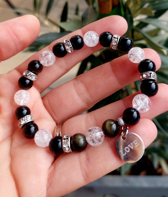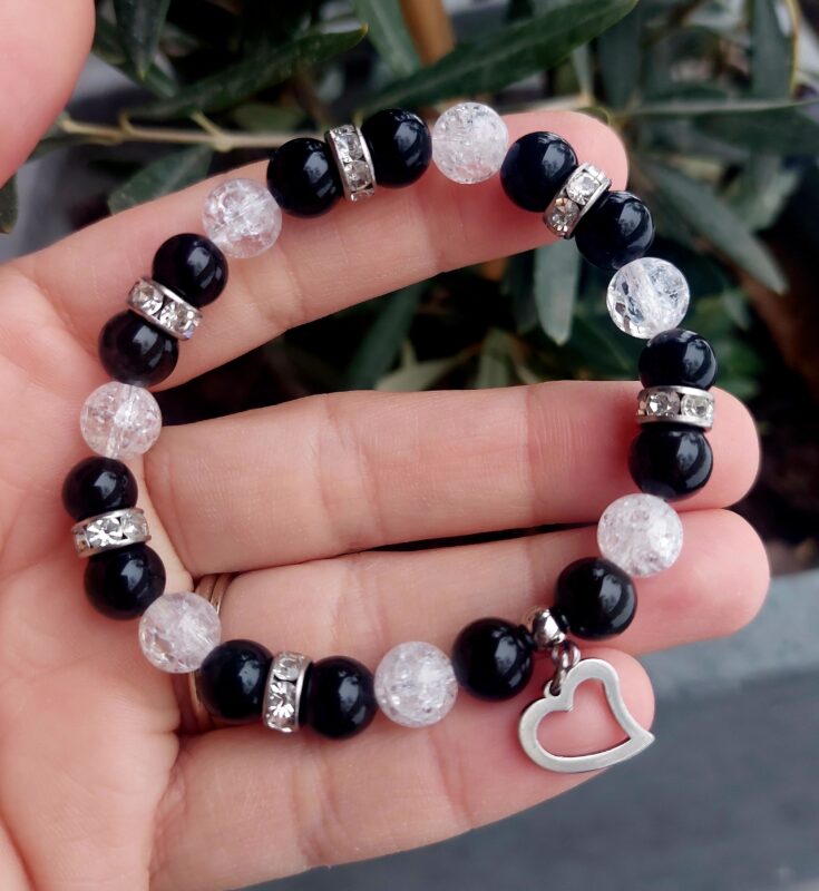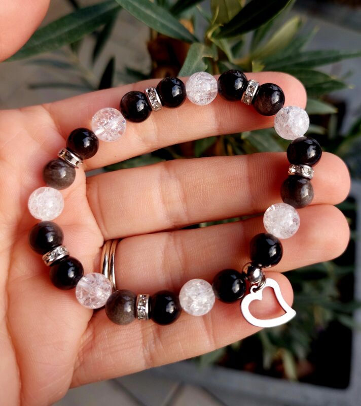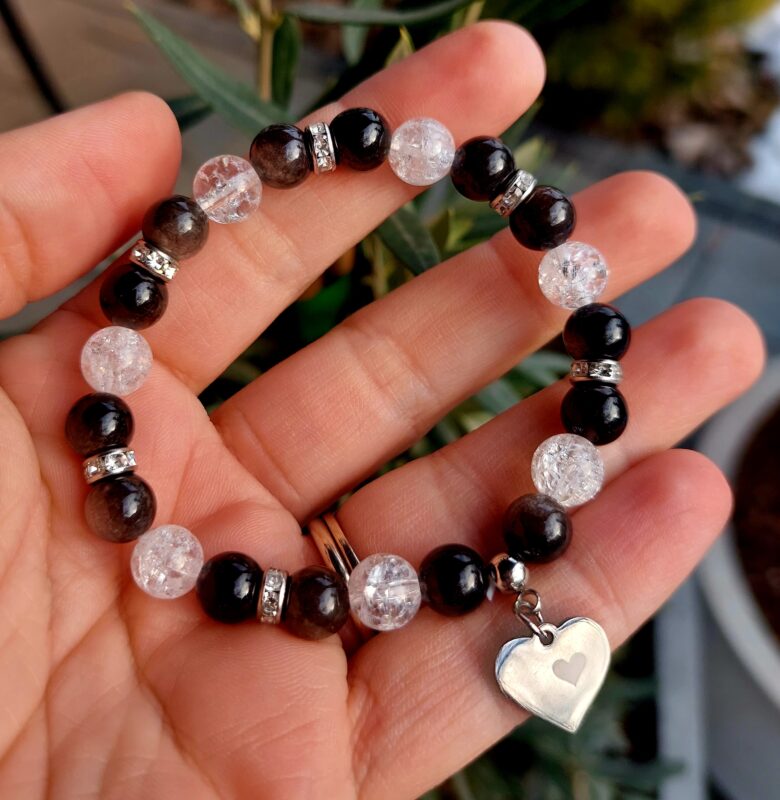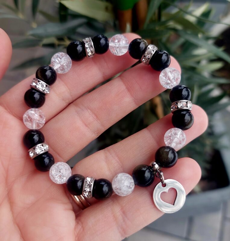 Obsidián strieborný + Krištáľ náramok 8mm Srdiečko