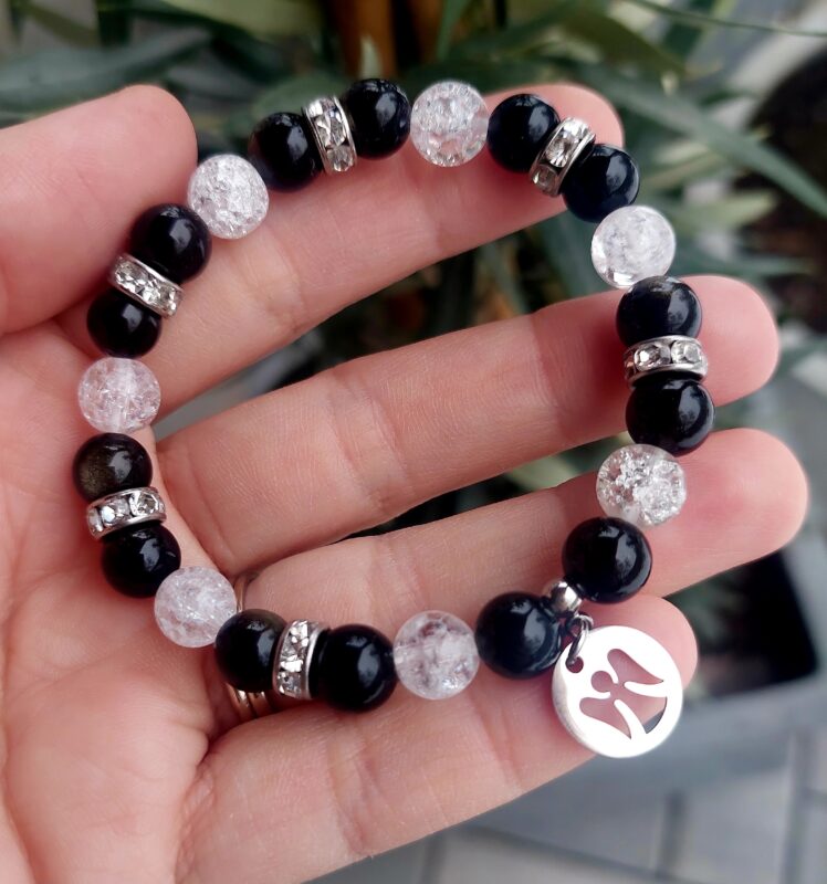 Obsidián zlatý + Krištáľ náramok 8mm Anjelik