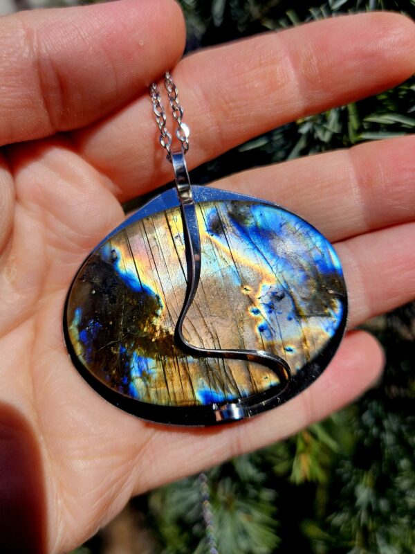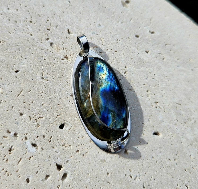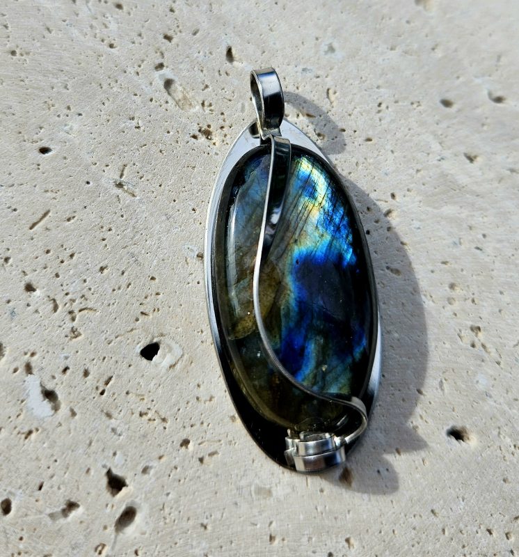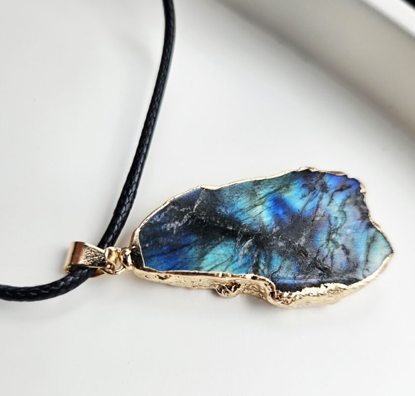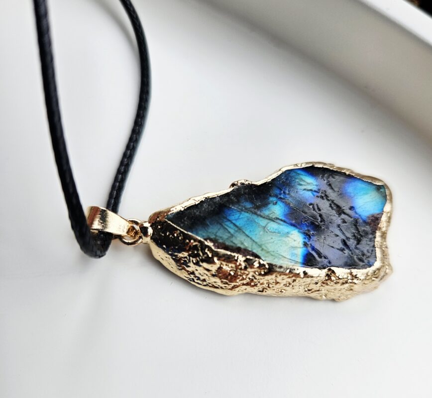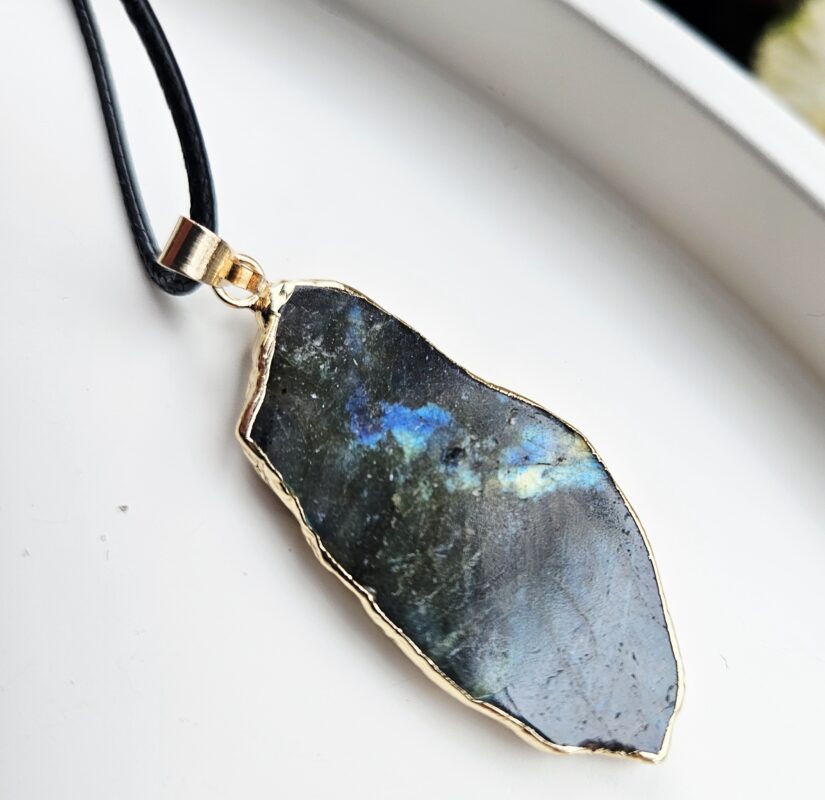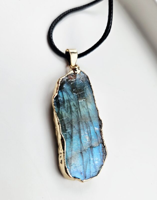 Exkluzívny prívesok z prírodného labradoritu s nádhernými modro-zelenými až zlatými odleskami, ktoré sa menia podľa dopadu svetla. Každý kameň je originál s jedinečnou kresbou a silnou energiou. Leštený labradorit v nepravidelnom tvare je po obvode jemne zvýraznený luxusným zlatým lemom, ktorý mu dodáva elegantný a nadčasový vzhľad.
