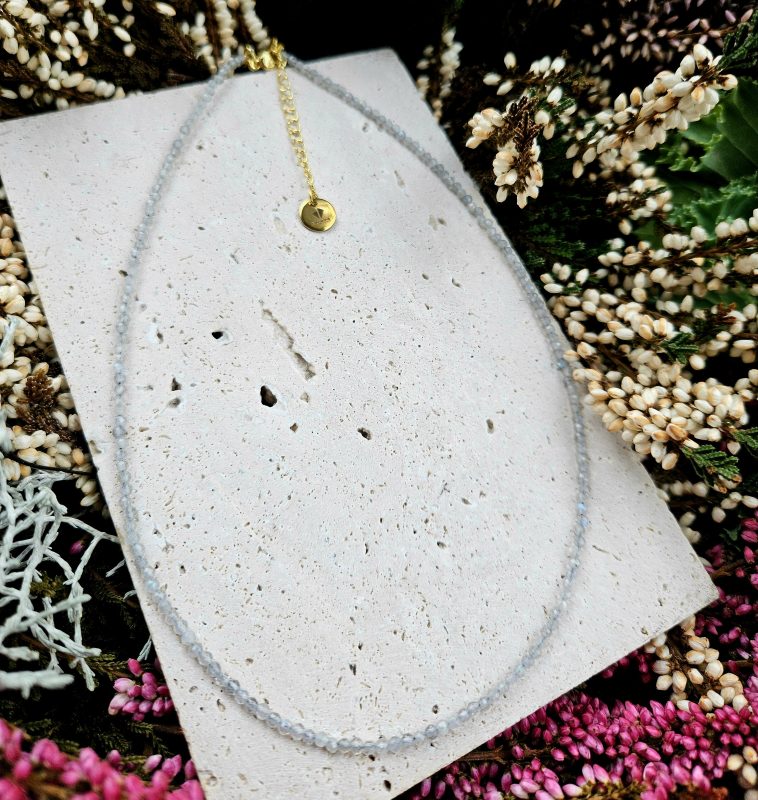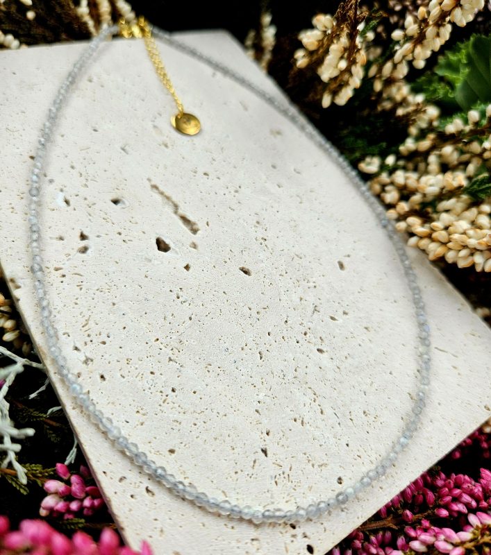 Jemný a nadčasový náhrdelník z prírodného labradoritu v podobe hladkých guľôčok s priemerom 6 mm. Kamene v sebe ukrývajú typické modré a dúhové odlesky, ktoré sa krásne menia podľa dopadu svetla.
