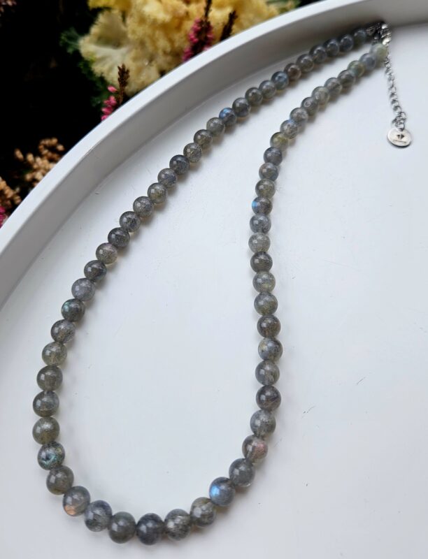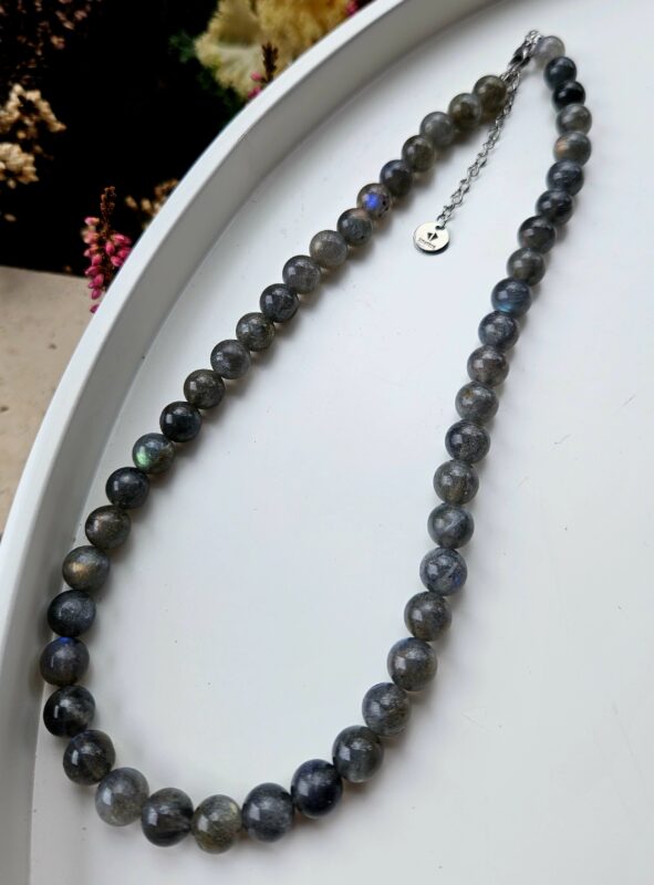 Jemný a nadčasový náhrdelník z prírodného labradoritu v podobe hladkých guľôčok s priemerom 8 mm. Kamene v sebe ukrývajú typické modré a dúhové odlesky, ktoré sa krásne menia podľa dopadu svetla.