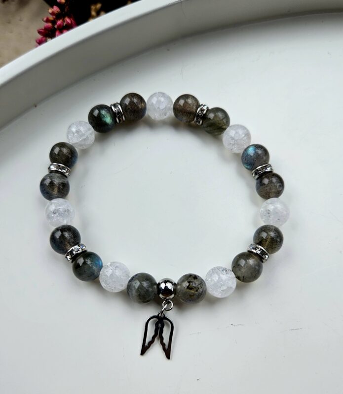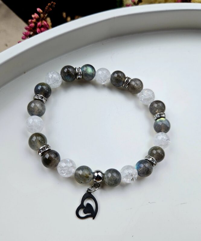 Exkluzívny náramok z prírodného labradoritu v kvalite AA, brúseného do hladkých 8 mm guľôčok s vysokým leskom doplnený praskaným Krištáľom. Kamene vynikajú výraznou labradorescenciou – modrými, tyrkysovými a zelenými odleskami, ktoré sa menia podľa dopadu svetla a robia každý kus jedinečným.