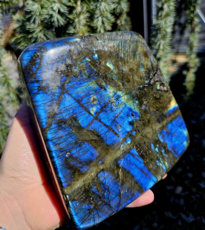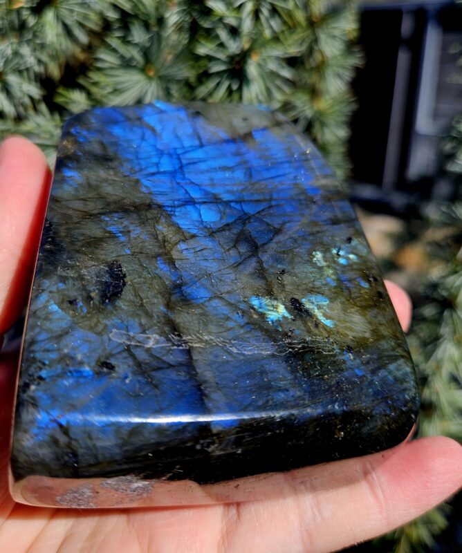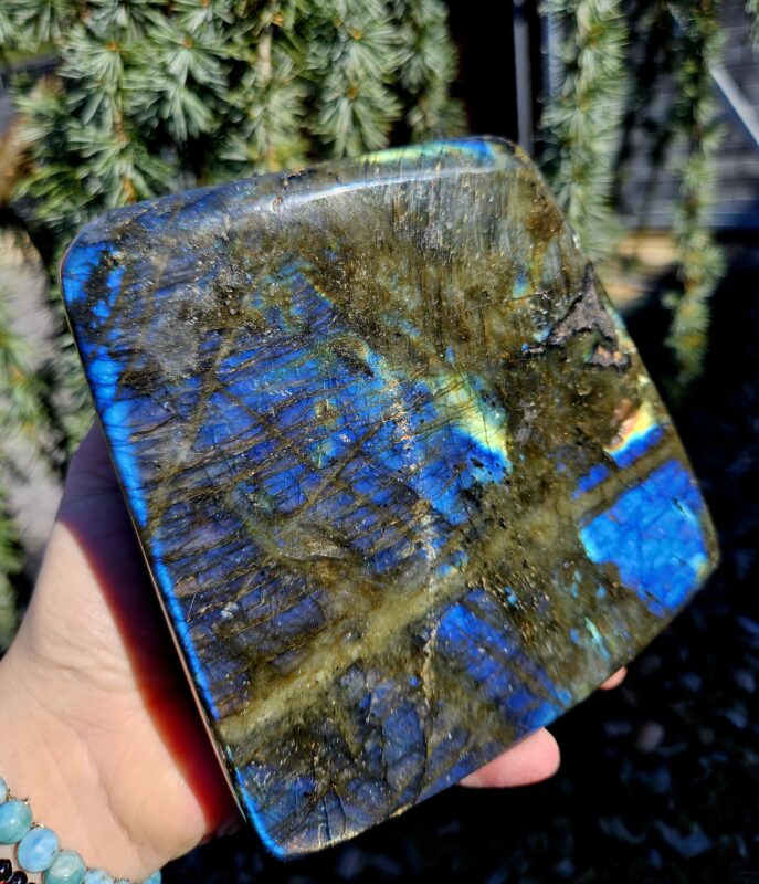 Toto je presne ten typ labradoritu, ktorý vám vezme dych. Masívny kus s nádhernou, sýto modrou labradorescenciou doplnenou o zlaté a zelené odlesky, ktoré sa menia s každým pohybom svetla. Jeho kresba pôsobí ako umelecké dielo – jedinečný, neopakovateľný vzor priamo z prírody.