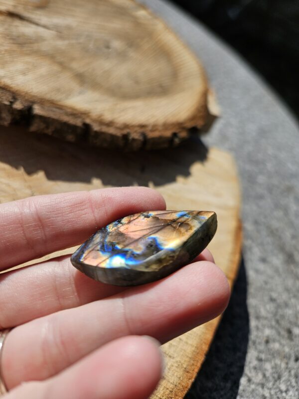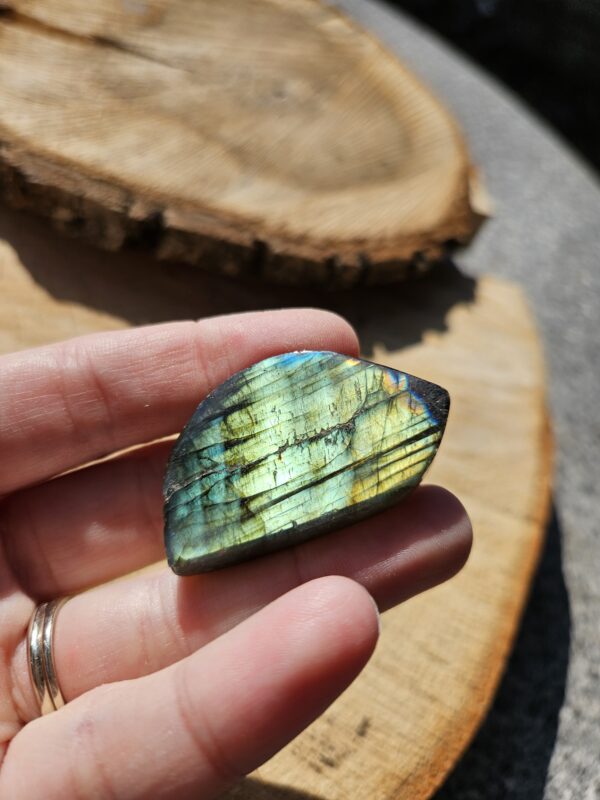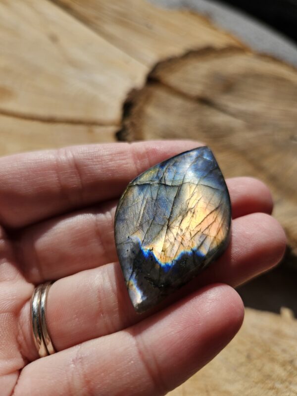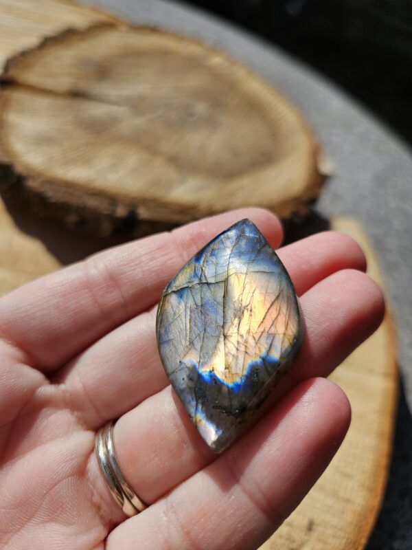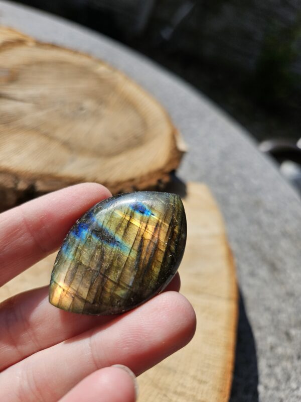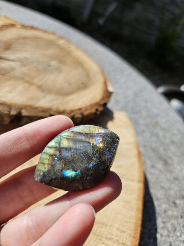 Nádherný labradorit s výrazným modrým zábleskom, ktorý pri dopade svetla ožíva fascinujúcou hrou farieb. Dominantné elektricky modré odlesky dopĺňajú jemné zlatisté a zelené tóny, vďaka čomu pôsobí tento kameň mimoriadne elegantne a mysticky.