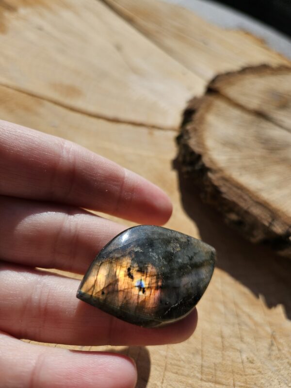 Tento leštený labradorit očarí svojou výraznou hrou farieb, kde sa prelínajú zlaté, fialové, modré aj jemne dúhové odlesky. Každý pohyb odhaľuje novú dimenziu jeho krásy, akoby sa svetlo prebúdzalo priamo v jeho vnútri. Hladký, príjemný povrch z neho robí ideálny kameň do dlane, ktorý môžete nosiť stále pri sebe.