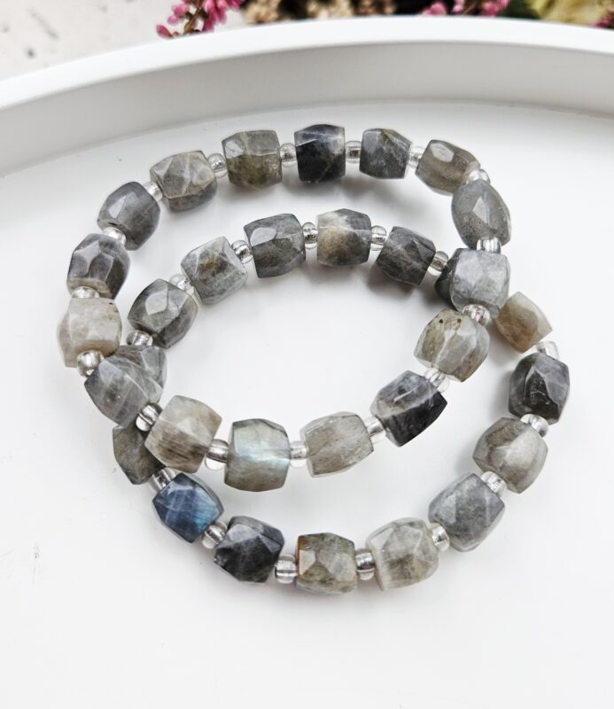 Elegantný náramok z prírodného labradoritu vytvorený z fazetovaných kociek veľkosti približne 8–10 mm, ktoré nádherne odrážajú svetlo a odhaľujú typický modro-sivý lesk labradoritu. Jemné odlesky dodávajú šperku jedinečný, tajomný charakter, vďaka ktorému je každý kus originál.