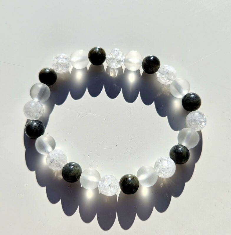 Tajomný a elegantný náramok vytvorený z praskaného krištáľu, matného krištáľu a prírodného labradoritu – kameňa ochrany, intuície a vnútornej premeny