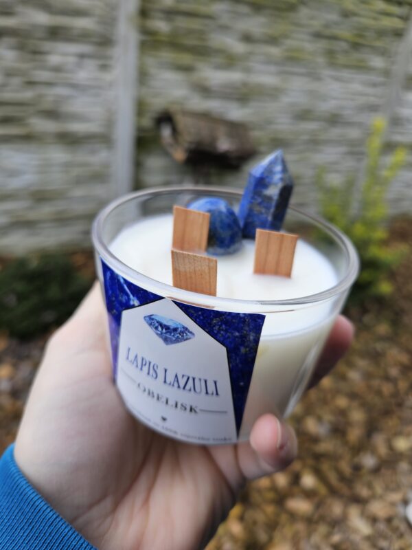 Lapis lazuli + krištáľ — Set „Hlbina múdrosti“ Nádherný lapis lazuli v kombinácii s krištáľom — silný, štruktúrovaný vzhľad s duchovným podtónom. Podporuje koncentráciu, sebavyjadrenie a vnútornú múdrosť. Materiál: lapis lazuli (8 mm) + krištáľ (8 mm) + kvietok 10 mm; komponenty chirurgická oceľ. Rozmer: guľôčky 8 mm, kvietok 10 mm. Vlastnosti: výrazné farby, vhodné k formálnejším aj boho outfitom. Tip: lapis lazuli by sa nemal dlho ponárať do vody — utrieť suchou alebo mierne vlhkou handričkou.Sviečka Sójová OBELISK Lapis Lazuli
