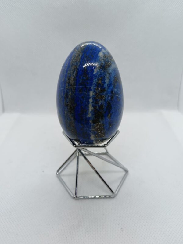 Výrazný leštený lapis lazuli pochádzajúci z Afganistanu, oblasti preslávenej najkvalitnejším lapisom na svete. Tento kus zaujme hlbokou kráľovskou modrou farbou s prirodzenými žilkami kalcitu a jemnými pyritovými inklúziami, ktoré mu dodávajú autentický a noblesný charakter. Elegantný tvar a veľkosť robia z tohto minerálu dominantný solitér do zbierky či interiéru.