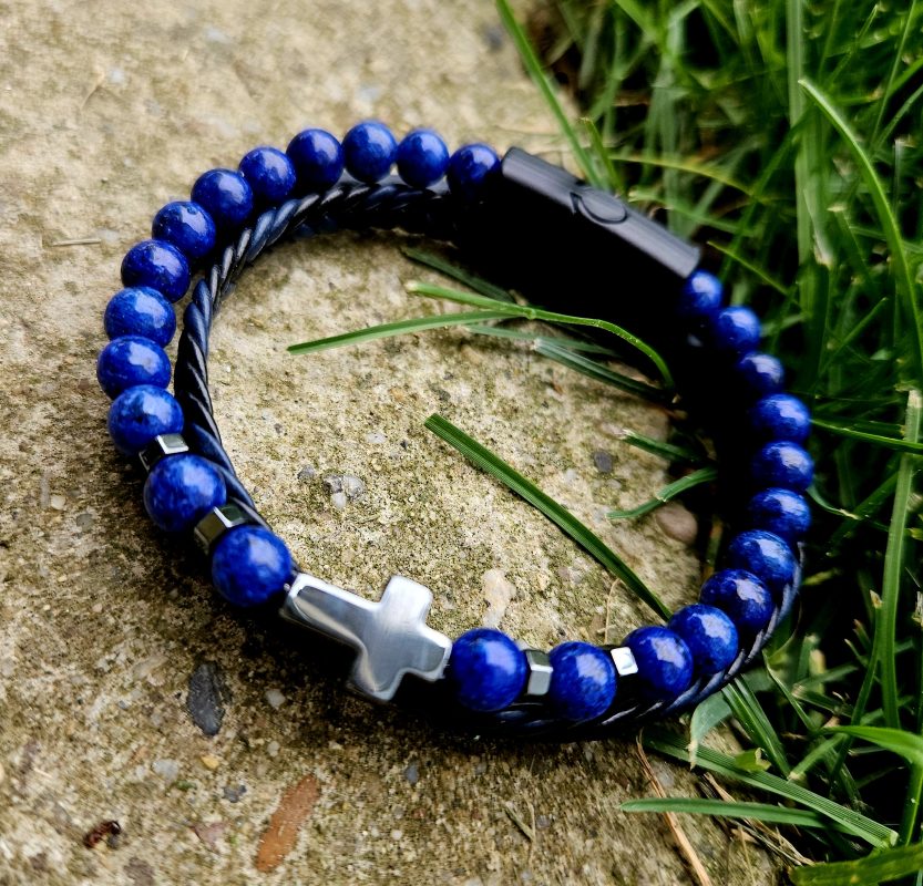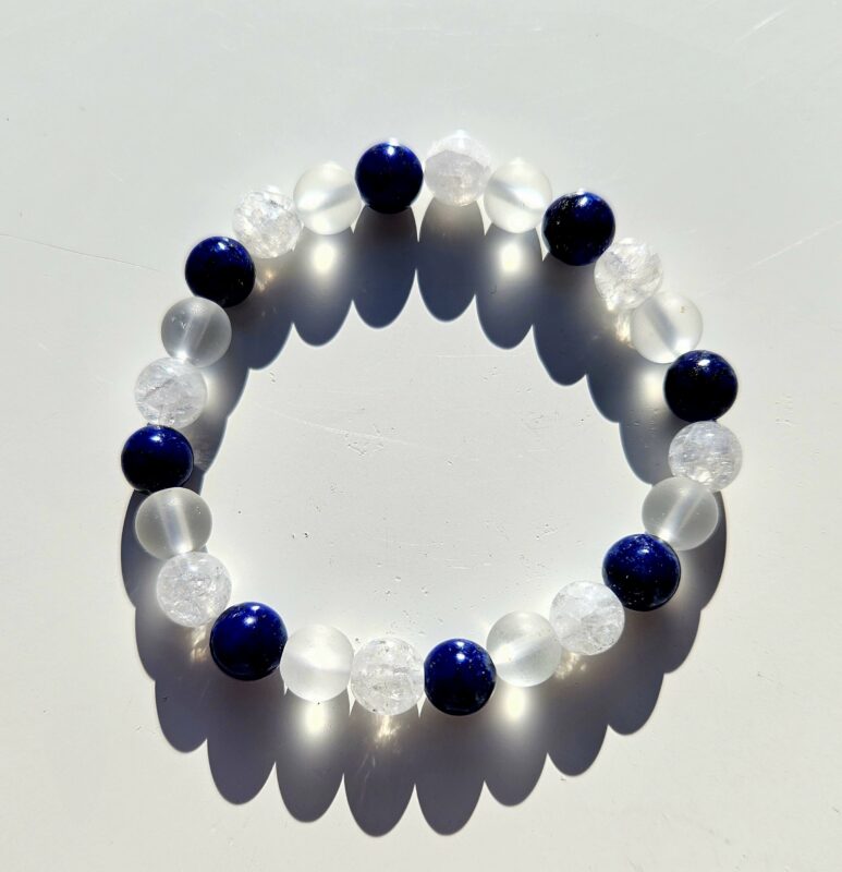 Lapis lazuli je od dávnych čias považovaný za kameň kráľov a duchovného poznania. Podporuje sebavyjadrenie, intuíciu a pomáha nájsť vnútorný pokoj a jasnosť mysle. V spojení s krištáľom, ktorý zosilňuje energiu minerálov, vzniká harmonický náramok plný svetla, hĺbky a elegancie.