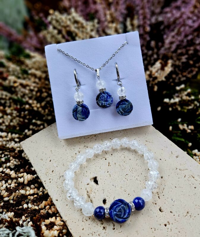 Lapis lazuli + Krištáľ SET KVIETOK (náramok, náušnice, prívesok na retiazke, krabička)