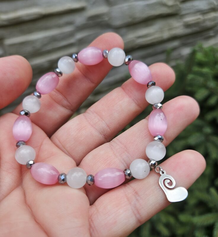 Mačacie oko ružové valčeky + biele 8mm náramok