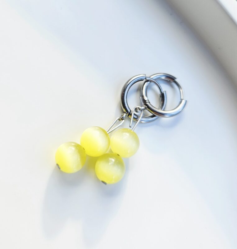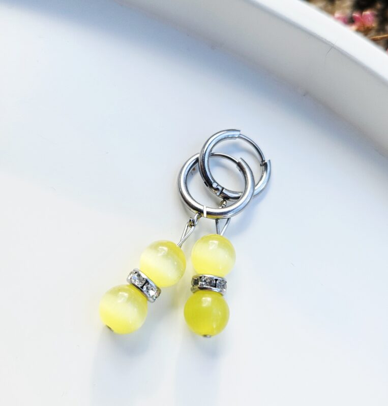Elegantné náušnice z minerálu mačacie oko v jemnom žltom odtieni, ktorý krásne zachytáva svetlo a vytvára typický hodvábny lesk. Tento efekt dodáva náušniciam výnimočný a mystický vzhľad.