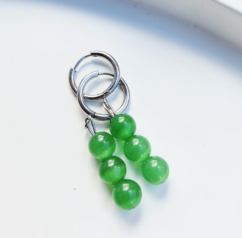 Elegantné náušnice z minerálu mačacie oko v jemnom zelenom odtieni, ktorý krásne zachytáva svetlo a vytvára typický hodvábny lesk. Tento efekt dodáva náušniciam výnimočný a mystický vzhľad.