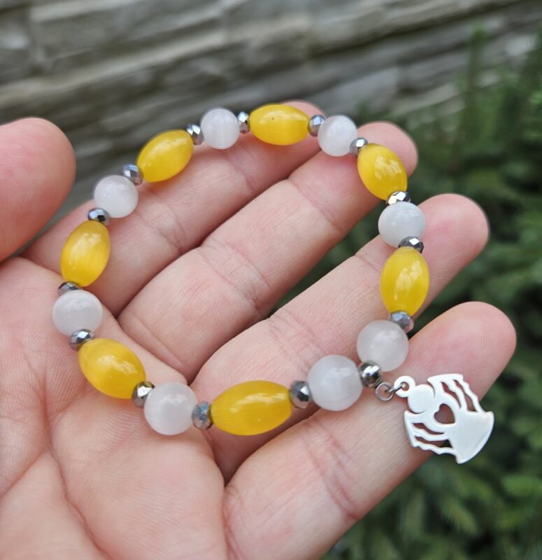 Mačacie oko žlté valčeky + biele 8mm náramok