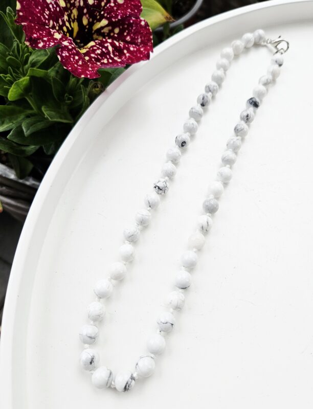 Jemná elegancia ukrytá v čistote bieleho minerálu s decentným mramorovaním. Magnezit pôsobí pokojne, harmonicky a vnáša do celkového vzhľadu ľahkosť a sofistikovanosť. Každá guľôčka je originál – jemné žilkovanie vytvára prirodzený, nadčasový šperk, ktorý sa hodí k akémukoľvek štýlu.