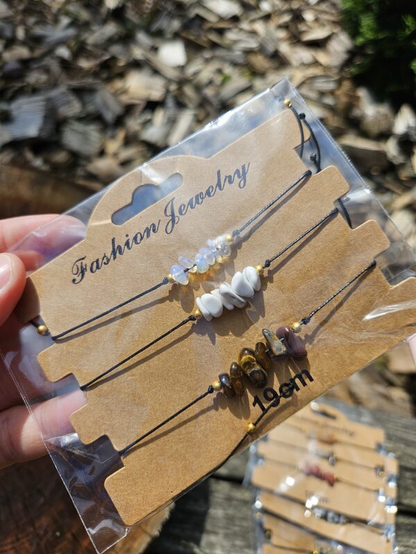 Magnezit + lepidolit — Set „Pokoj a uzemnenie“ Jemný, zamatový magnezit v páre s lepidolitom — upokojujúca kombinácia, ktorá pomáha pri zvládaní stresu a upokojuje emócie. Skvelý set pre každodenné nosenie. Materiál: magnezit (8 mm) + lepidolit (8 mm) + kvietok 10 mm, chirurgická oceľ. Rozmer: guľôčky 8 mm, kvietok 10 mm. Vlastnosti: decentný pastelový vzhľad, neutrálne ladí s väčšinou outfitov. Tip: vhodné nosiť pri náročných dňoch; lepidolit je citlivý na kyslé prostredie — vyhnúť sa dlhému kontaktu s parfumami.Sada 3 náramkov z lámaných minerálov na zaťahovanie č.14 Opalit, Magnezit, Tigrie oko