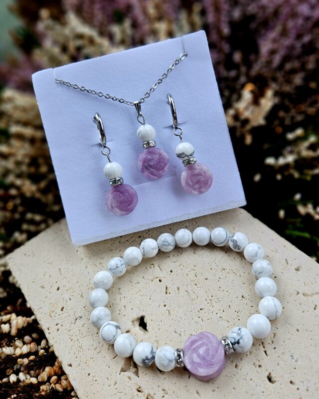 Lepidolit + Magnezit SET KVIETOK (náramok, náušnice, prívesok na retiazke, krabička)