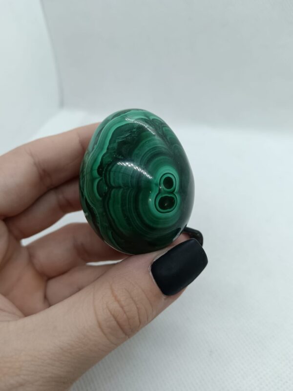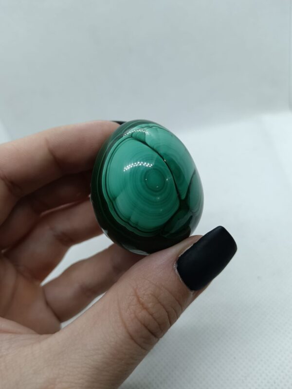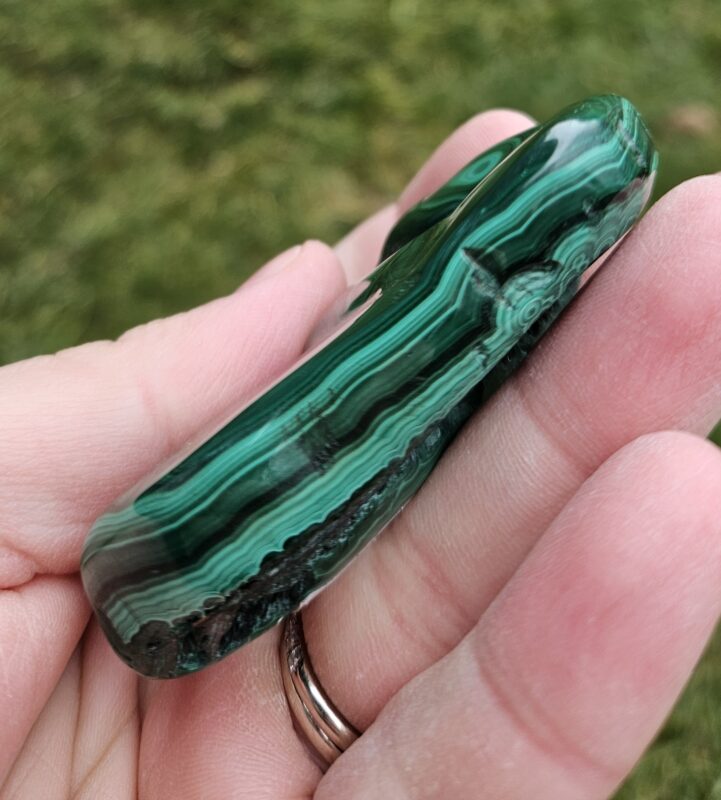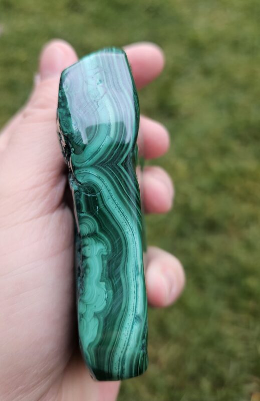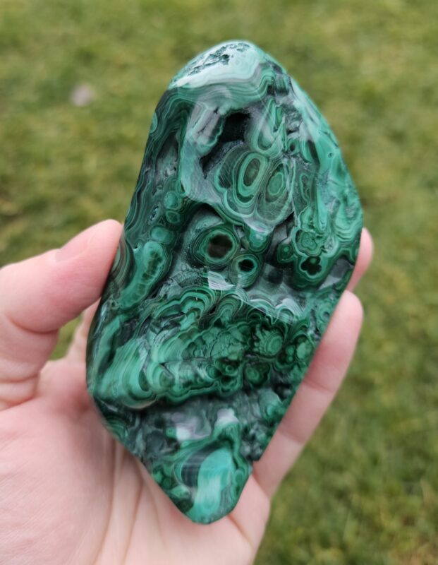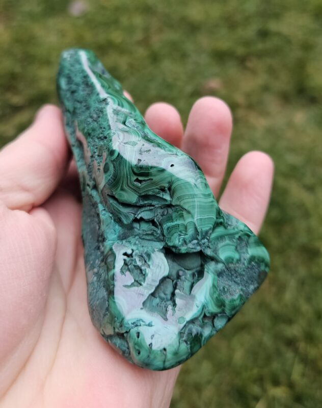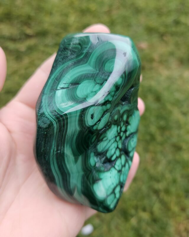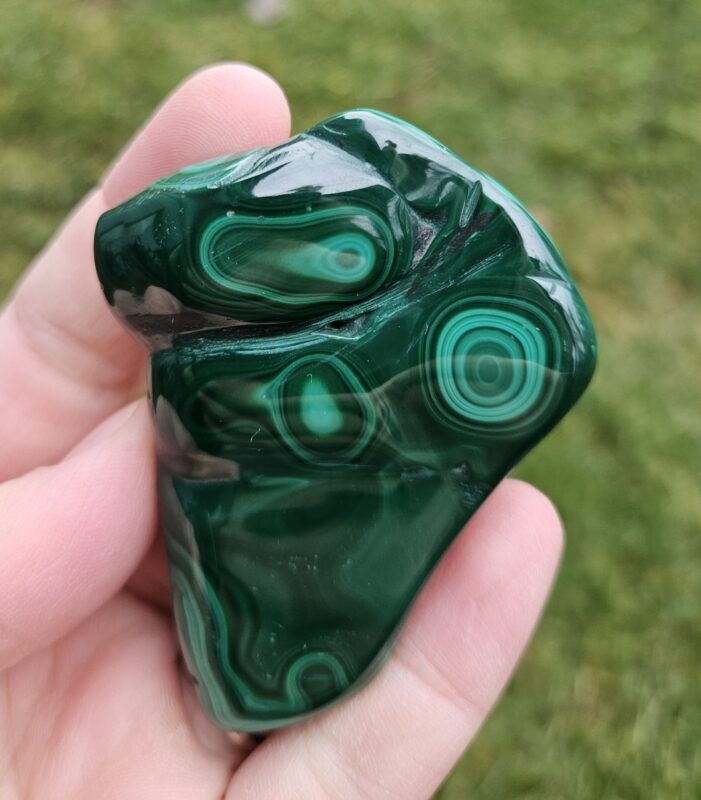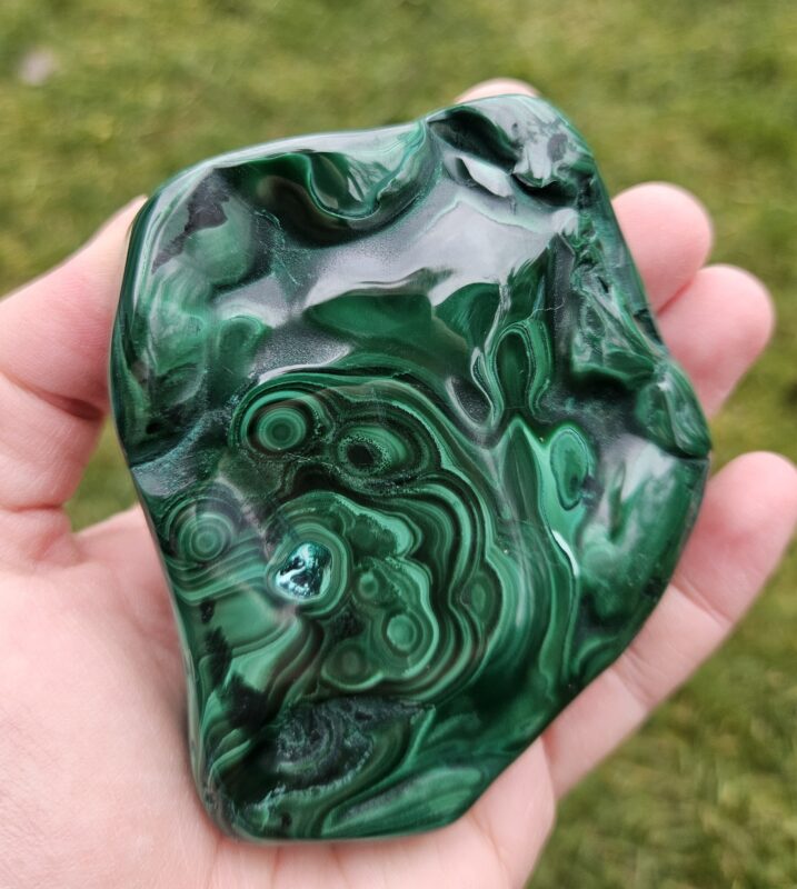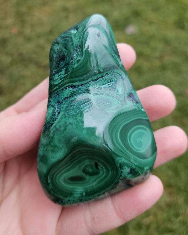 Tento výnimočný malachit v leštenom free form tvare zaujme na prvý pohľad svojou hlbokou zelenou farbou a jedinečnými prírodnými kresbami, ktoré vytvárajú typické kruhy a vlny – akoby v sebe niesol živú energiu Zeme.